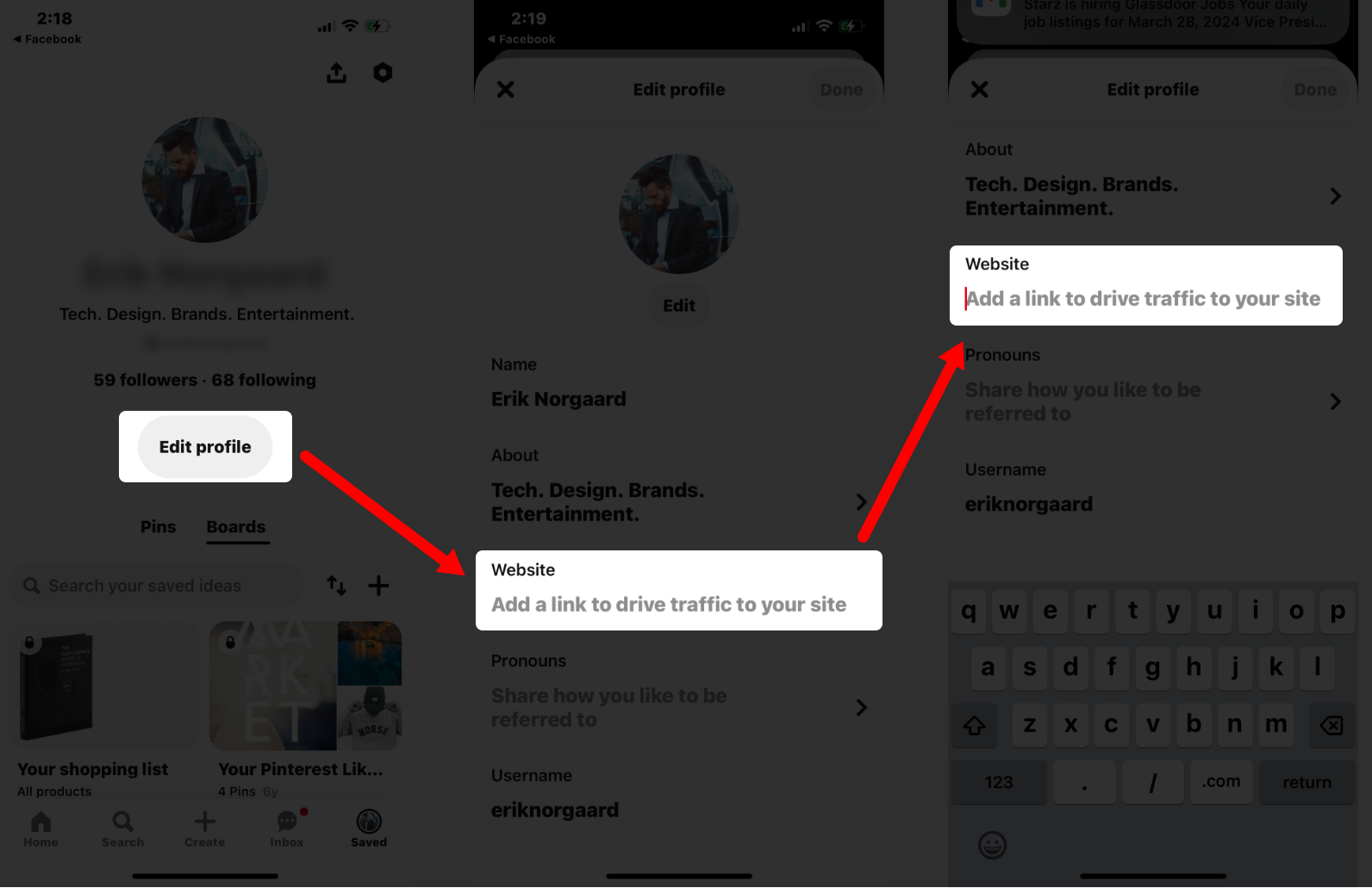 On mobile device: Here’s how to add a link to your Pinterest bio: