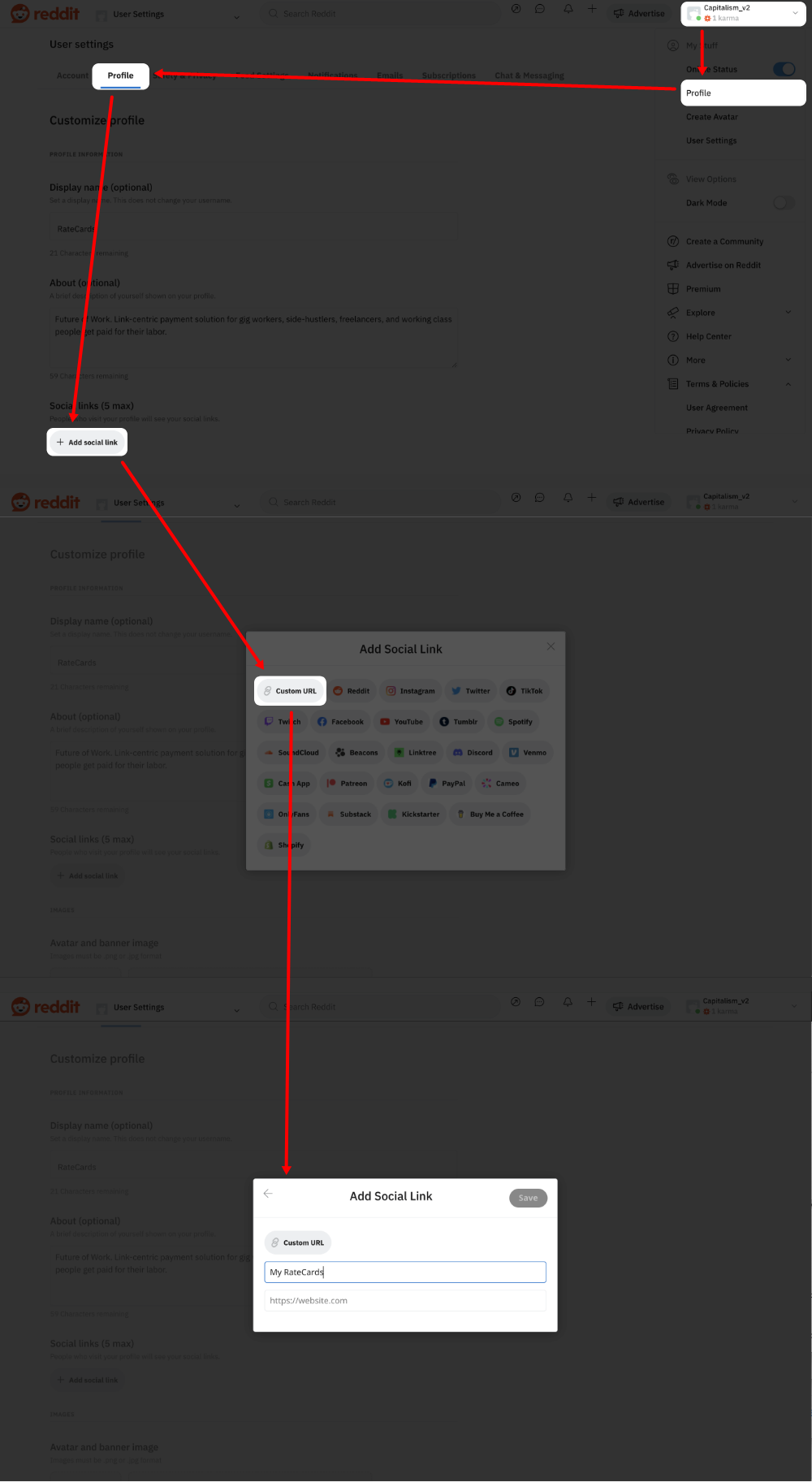 On desktop web browser: Here’s how to add a link to your Reddit bio:
